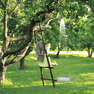 Un système de douche ultra simple à installer pour se rafraîchir dans un cadre bucolique qui nous fait craquer ! Un tuyau d’arrosage enlacé sur le tronc jusqu’à la première branche, un pommeau de douche suspendu au bout et pourquoi pas comme ici, une échelle pour jouer les cro magnons ou ranger les serviettes de bain ! Source : Handmade Charlotte.
