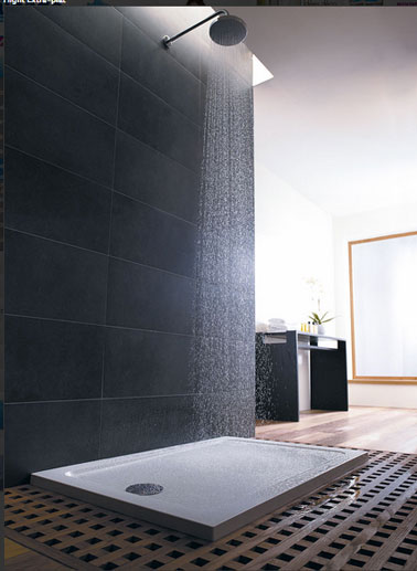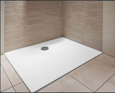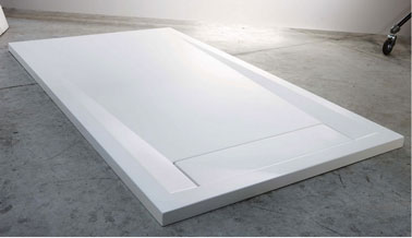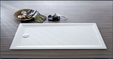 Un receveur douche italienne conçu à base de charge minérale qui présente l’avantage d’être plus résistant aux chocs et moins glissant que la céramique. Traité antibactérien dans la masse. Existe en plusieurs dimensions, la plus grande : 1,70cm. Exemple de prix : 120 x 80 x 4 cm : 466 € .76 x 76 cm : 360 € Receveur Flight Extra-plat Jacob Delafon chez Aubade