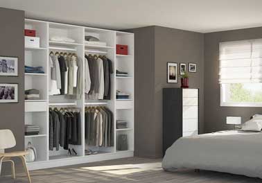 Dans cette grande chambre un dressing en L est aménagé jusqu’au plafond avec des colonnes de différentes largeurs pour répondre aux besoins de stockage. Les plus grands servent de penderie et à ranger couettes et linge de maison encombrants directement sur les étagères ou dans des paniers en osier par exemple. Les petites cases permettent d’empiler au carré pulls et tee-shirt… A vous de choisir la configuration de votre dressing en fonction de vos habitudes de rangement. Penser à intégrer des tiroirs ( quatre tiroirs assortis dans ce modèle ) est aussi une excellente option pour un rangement nickel des petits accessoires comme les ceintures, foulards, chaussettes et petite lingerie. Un dressing blanc, bien éclairé par des spots encastrés au plafond qui s’intègre à merveille dans cette chambre grise à la déco moderne. Dressing en L blanc alpin
