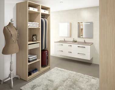 La chambre parentale gagne de la place avec ce dressing ouvert en chêne. Aménagé en deux colonnes contre un mur de la chambre, il libère la place et n’encombre pas le passage. Compact, il n’en reste pas moins fonctionnel avec sa surface de rangement composée d’un tiroir, d’une penderie et de grandes et petites étagères. Sa finition s’harmonise parfaitement avec les couleurs de la chambre. Dressing ouvert décor chêne. Dim. L 1 m, H 2,04 m, P 55 cm, à partir de 483€