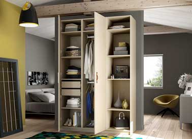 Dans cette chambre sous comble exploiter la surface avec un dressing cloison sur mesure s’est avéré la meilleure solution pour optimiser l’espace. Aménagé avec deux portes battantes et une colonne étagère ouverte, il renferme une petite penderie organisée en deux barres de penderie sur deux niveaux. Les caissons de rangement profonds sont complétés de deux tiroirs. Complet et bien pensé, ce dressing déco chêne fait écho aux couleurs de la poutre et du parquet et se marie aux couleurs anis et taupe de la chambre.Armoire dressing avec portes battantes.