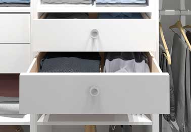 Un exemple d’aménagement de dressing avec des tiroirs blancs. Bien accessibles avec leur ouverture totale, ils sont également équipés d’amortisseurs pour limiter les chocs et résister par la même occasion à l’usure du temps. Entièrement personnalisables, vous pouvez choisir leurs dimensions mais aussi la couleur et le style des poignets pour les harmoniser à la déco de votre pièce. Ensuite, à vous d’intégrer vos tiroirs en solo ou en duo dans une colonne de rangement et pourquoi pas au centre de l’armoire sur plusieurs niveaux si vous en avez l’utilité.
