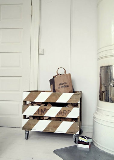 Quand les palettes servent à ranger les bûches près de la cheminée on se dit qu’il doit y avoir une histoire de bois là dessous  !  Il faut avouer que l’idée est sympa. Alors pour vous offrir ce range bûche original, le caisson se fabrique à partir de deux palettes que l’on désosse entièrement pour ne conserver que les plateaux. Plateaux qui sont ensuite assemblés sur les traverses récupérés à la démonte et recoupées à 50 cm. Ensuite, pas indispensable mais sympa, un coup de peinture au pochoir par exemple apportera la touche déco à votre nouveau range bûches. Là aussi pour une mobilité aisée, monter des grosses roulettes sous les palettes est bien pratique.