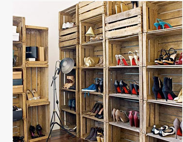 Pratique pour ranger des tas de chaussures, un dressing composé à partir de caisses en bois empilées les unes sur les autres sur toute la hauteur des murs de la pièce.Fans de chaussures, une solution aussi économique que pratique pour ranger vos collections de chaussures tout en les ayant à portée de mains. Le dressing  est fabriqué avec des caisse en bois empilées les unes au-dessus des autres. Chaque caisse peut contenir trois à quatre paires de chaussures selon leur taille et style. Pour ranger bottes et autres accessoires, l’astuce gain de place c’est d’inverser le sens des caisses pour bénéficier de la hauteur.