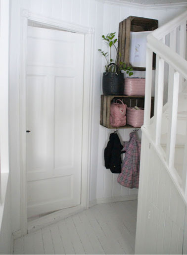 Pour crocher manteaux et déposer les sacs dans l’entrée de la maison sans négliger l’aspect déco,  voilà une idée facile et pas chère pour faire des rangements étagères avec des caisses en bois fixées au mur accueillir sacs et objets de décoration. Pour suspendre les vêtements, de gros crochets sont fixés sur la base de la première caisse. Ici, le bois a été laissé brut pour former un contrast sympa avec les murs et le parquet peints en blanc pur.