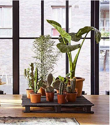 Regrouper ses plantes en pot sur une palette, une bonne idée pour créer un petit jardin d’hiver dans le salon !