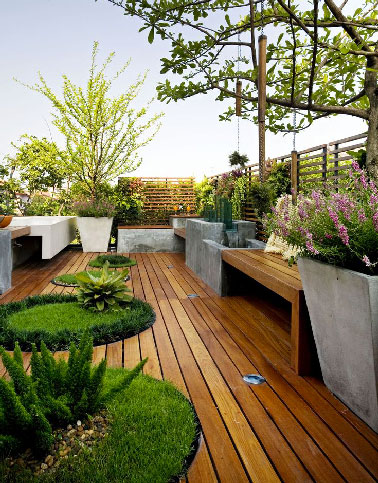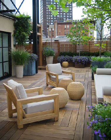 En ville, la terrasse en bois possède tous les atouts de confort et d'esthétique pour faire oublier le béton. Conjuguer à un salon de jardin en bois, l'ensemble devient irrésistiblement charmant