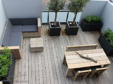 Le revêtement de sol en bois n’est pas réservé aux sols des terrasses de jardin. Pour rompre avec l’ambiance béton du centre ville, la terrasse d’un appartement se transforme du tout au tout avec un sol en bois. Et pour accentuer son impact, rien ne mieux que de meubler la terrasse d’un salon de jardin en bois dans la même teinte que l’essence du sol. Peter Hoek.