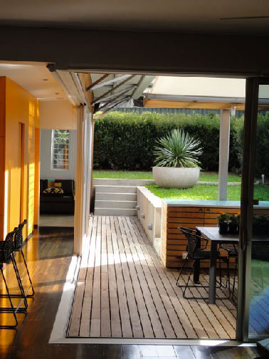Un accès direct à la cuisine d'été par une jolie petite terrasse en bois mise en valeur par le carrelage et les murets de briques. Un aménagement et un choix de revêtement de sol qui optimise l’espace restreint depuis la maison.