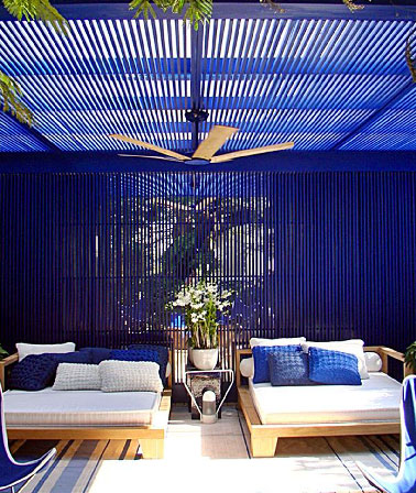 Sous le toit du patio en bois recouvert d’une lumineuse peinture bleu et protégé des courants d’air par une claustra bois dans le même ton de bleu, se prélasser sur la terrasse bien caler dans les bains de soleil de taille XXL prend des allures de jardin d’Eden.