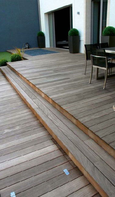 Lorsque le terrain s’y prête et que la surface la maison est au rendez-vous, une terrasse sur deux niveaux c’est bien sympa. Et quand elle est en bois l’extérieur aux abords de la maison devient vraiment agréable à vivre. Comme sur cette terrasse en ipé qui couvre toute la longueur de la façade et se prolonge via une petite marche par un plancher de bois sur une bonne largeur. Lames en ipé, profil droit, une face rainurée, une face lisse, Longueur :1,45 m. Prix 89,90 €/m2, Point.P.
