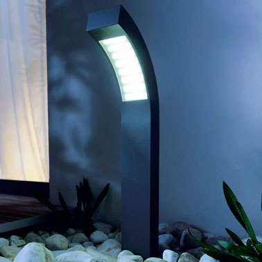 Borne luminaire extérieur à LED à planter dans les allées du jardin ou près de la porte d'entrée de la maisonPour l’éclairage  des bords d’allées du jardin ou la zone de la porte d’entrée de la maison, une borne extérieur à LED à planter. Matière : plastique et aluminium. Dimensions : L8.4 cm x l 17 cm x H 60 cm Ampoule Led 32 x 0.1 Watts éclairage blanc. Prix : 59.95 € Borne extérieure Ross chez Castorama