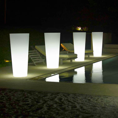 luminaire extérieur forme boule éclairage par LED avec variateur de couleurs par télécommande. Peut se mettre dans une piscineAutre version de boule lumineuse multicolore fonctionnant avec Led. Le changement des couleurs se fait par télécommande. L’autonomie est de 6 à 8 heures. Cette version de boule lumineuse permet une immersion dans une piscine ou un bassin d’eau. Diamètre : 50cm. Prix : 119 € chez Castorama.Un luminaire extérieur design pour piscine, de grands pots façon jarre avec lumineux éclairage blanc Un luminaire design pour l’extérieur qui fera son effet au bord de la piscine ou placer en paire devant la porte d’entrée. Pour se rendre utile le jour le pot, façon grande jarre, peut aussi servir de cache-pot. Matière : Polycarbonate. Dimensions : ø 37 x h.75 cm. longueur du câble : 290 cm. Pot lumineux Ilie Light + kit d’éclairage. Prix : 185 € chez Castorama