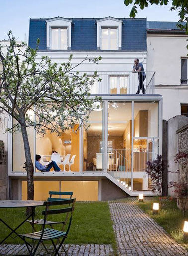 Une extension maison contemporaine c’est bien aussi pour moderniser et mettre en valeur un bâtiment ancien. Les propriétaires de cette maison parisienne du XXème siècle l’ont bien compris en réalisant leur agrandissement de maison tout en verre. Transparence, légèreté et modernité, c’est le triplé gagnant d’une extension de maison de ville réussie.