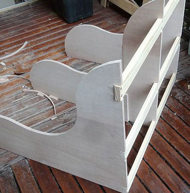 Pour fabriquer l’assise du banc, découper deux montants en bois dans du contreplaqué marine pour former les côtés et un troisième qui va servir à renforcer la stabilité du banc. Pour dessiner les courbes, utiliser par exemple un couvercle de barbecue ou de grande casserole en guise de patron. ceci fait, faire 3 encoches en haut, milieu et bas au dos des plaques pour y loger des tasseaux de bois et ainsi former le dossier du banc.