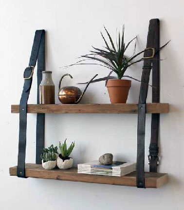 Dans le même esprit bois et cuir, des étagères à fabriquer avec deux bandoulières de récup clouées directement sur les planches avant de les fixer au mur qui supporteront sans problèmes petits bibelots et quelques livres.
