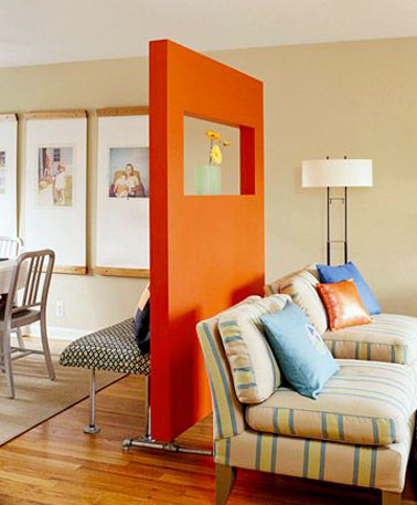 Séparer le salon de la salle à manger avec une cloison amovible faite maison originale avec sa fenêtre découpée dans le bois.