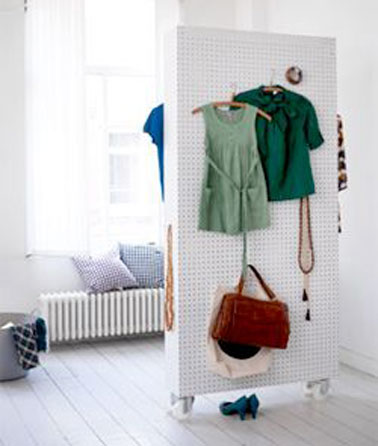 Cette cloison amovible se fabrique sur le même principe de châssis bois que la précédente mais est encore plus simple à réaliser puisque le cadre se monte à partir de quatre tasseaux de bois. Le châssis assemblé, fixer des roulettes sur sa base puis terminer la cloison en l’habillant d’isorel perforé qui restera à mettre en couleur avec un peu de peinture. Et voilà une cloison qui peut se placer dans l’entrée pour servir aussi de porte manteau, ou dans une chambre partagée par deux enfants qui peuvent alors l’utiliser en petit dressing. Autre idée d’utilisation de cette cloison amovible pleine d’astuces rangement : pour séparer le coin bureau de celui du lit dans une chambre d’ado.