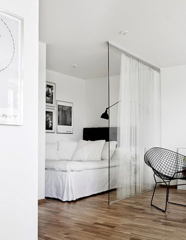 Une cloison intéressante à fabriquer dans une chambre lorsque l’on souhaite profiter de la vue et de la lumière de toute la pièce et pouvoir la fermer par le rideau pour s’isoler. Pour ce faire, commencer par fixer une plaque d’altuglas sur deux rails posés sol/ plafond, puis tendre un câble métallique pour suspendre le rideau de voile coulissant.