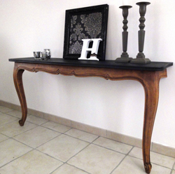 - Sur cette console, l’aspect ciré de la table coupée est conservé seul le plateau est peint en soir satin pour lui donner un coup de jeune