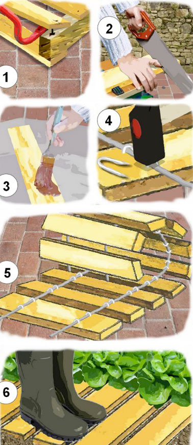 Après séchage, étendre les planches sur deux longueurs de fils de fer galvanisé en les espaçant de 3 à 4 cm. Attacher les planches au fil de fer à l’aide de cavaliers. Voilà, l’allée de jardin mobile est terminée, il ne reste plus qu’à la mettre en place et à la retirer dès qu’il n’est plus nécessaire de protéger le sol.