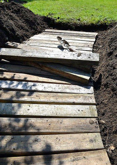 Démonter les palettes à l’aide d’un arrache-clou et d’un marteau et choisir les plus belles planches. Disposer ensuite les traverse tout le long du chemin afin d’avoir une vision sur la future allée. Lorsque leur emplacement est validé, retirer la couche d’herbe sous les traverses en glissant la bêche par dessous. Gratter le fond puis enterrer les traverses de sorte qu’elles soient au même niveau que le terrain. (Si le terrain est fréquemment humide, disposer une couche de graviers avant de remettre les planches pour bloquer le fond) puis combler les espacements avec de la terre et les mottes de pelouse avant de bien tasser l’ensembles.