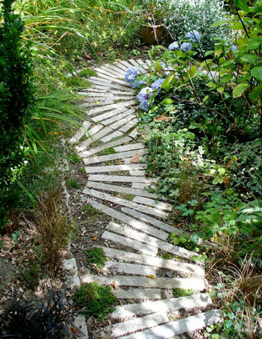 Une élégante allée de jardin fait à partir de planches de palette en bois posées sur du gravier de cailloux de divers couleurs, en accord avec les plantes autour.