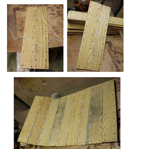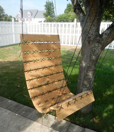 C’est maintenant que votre fauteuil suspendu va prendre corps : placer deux planches côte à côte puis lacer les en commençant par une des extrémités des planches comme on le fait pour lacer ses chaussures. Répéter l’opération jusqu’à avoir fixé toutes les planches entre elles. Veiller à avoir suffisamment de mou à la fin de la corde pour former un noeud solide et penser à brûler les extrémités de la corde pour éviter qu’elle s’effiloche.