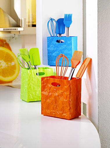 Du peps dans la cuisine avec ces sacs à ustensiles ! sac en polypropylène conçu pour un usage alimentaire accompagné d’un fouet, d’un pinceau et d’une spatule couleur avec une poignée en métal. Prix : 24.90 €