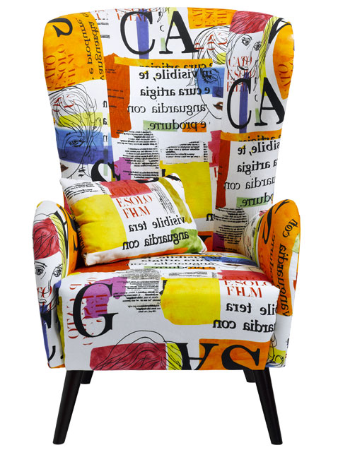 Fauteuil à oreille pied bois, tissu imprime couleur style vintage moderne de Helline