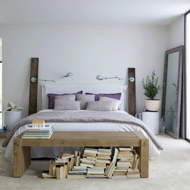 Une bonne idée déco pour une chambre zen avec cette tête de lit composée de trois éléments : Un matelas de récup, ou un bloc de mousse de 5 ou 6 cm d’épaisseur et 140 cm de long sur 90 cm de hauteur recouvert d’un tissu de coton blanc fixé au mur, deux planches de récup simplement posées le long du mur qui servent aussi de support pour fixer deux spots rétro. Si les murs de votre chambre ne sont pas blanc, il suffit d’harmoniser la couleur du tissu de la tête de lit à celle de la chambre ou à la couleur du linge de lit.