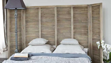 Une tête de lit sympa pour une chambre adulte réalisée avec des persiennes de récup et légèrement lasurées gris