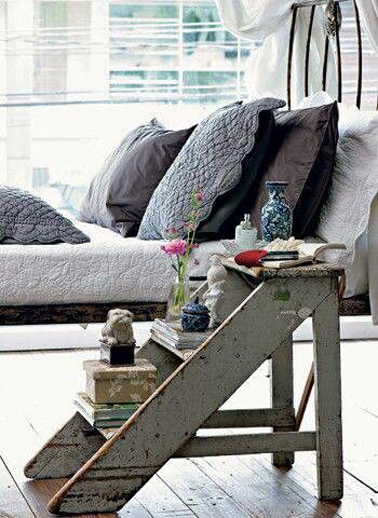 Un escabeau en bois récupéré dans le grenier qui s’offre une deuxième vie dans la chambre en se transformant en table de nuit et qui trouve que ces trois marches sont bien pratiques pour ranger livres et bibelots près du lit.