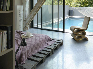 Un lit en palettes juste surélevé du sol de sa seule hauteur histoire de lézarder et de profiter de la vue sur la piscine jusqu’au moment du plongeon. Pour ne pas surcharger de meubles cette chambre zen, les quatre palettes en bois servent de sommier et table de nuit où tout naturellement la lampe de chevet rétro trouve sa place.