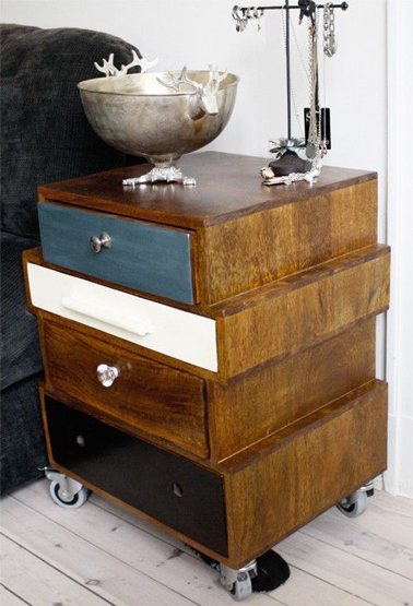 Pourquoi jeter les tiroirs d’un vieux meuble lorsqu’ils peuvent être récupérés et transformés en table de nuit pour une déco de chambre dans le pur esprit récup ? On joue sur la largeur des tiroirs que l’on empile et colle les uns sur les autres et pour le côté pratique on fixe des roulettes sur le premier tiroir. Dernière étape, on peint les façades des tiroirs aux couleurs de la chambre.