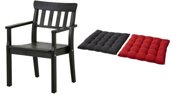 Chaise à accoudoirs en pin massif peinture couleur noir facile à placer sur un petit balcon avec ses dimensions compactes : L 60cm, P 59, H 85 cm desing Carina Bengs. Prix : 75 € à complèter d’un coussin rouge ou noir Hallö. Taille 50X50. 12.95 € chez Ikéa.