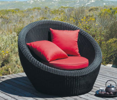 A placer en solo ou multiple sur la terrasse ou le jardin, un fauteuil coque qui nous invite à la détente. Pouf en résine tressé noir et coussins rouges. L’ensemble 399 € chez Maison du Monde.