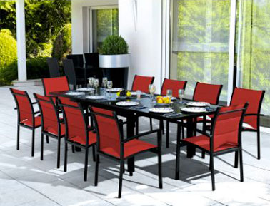 Salon de jardin avec table plateau coulissant permettant de doubler sa longueur. Chaises assorties assise rouge, cadre noir