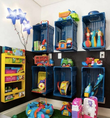 Utilisez des caisses en plastique colorées pour créer des compartiments pratiques et déco dans la salle de jeux, en voilà une bonne idée ! Fixées au mur, les caisses pourront accueillir tous les jouets et éviter la pagaille dans la pièce. Une idée originale à reproduire facilement pour le plus grand bonheur des enfants.