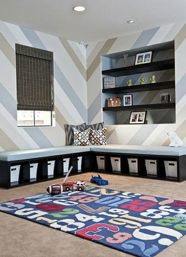 La niche de rangement où des étagères ont été aménagées ainsi que les compartiments sous la banquette dans lesquels des paniers ont été placés constituent des espaces de rangements pratiques dans cette salle de jeux moderne et sympathique comme tout ! Un aménagement idéal pour que enfants se sentent bien et profitent à 100% de leur espace !
