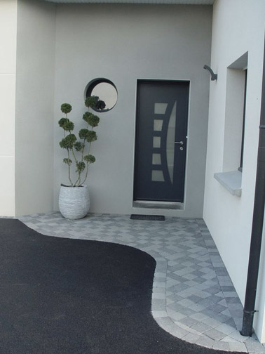 Combinaison de gris clair et de gris anthracite devant la maison ! Le béton rejoint en courbe le sol en damier devant l’entrée et rappelle le gris de la porte principale pour un effet déco qui ne manque pas de modernité !