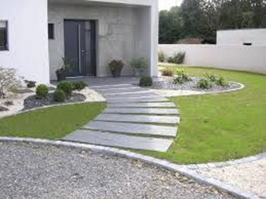Les pas japonais se marient joliment avec la pelouse devant cette maison et assurent un accueil chaleureux de vos convives. Une devanture de maison dégagée, coquette et bien agencée qui en jette  !