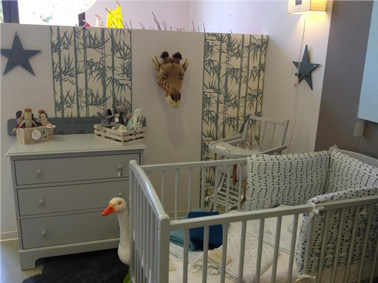 Pour la décoration de cette chambre de bébé réalisée par la décoratrice Emmanuelle Marcelin, ce sont deux lés uniques qui animent les murs peints en gris pastel. Lé unique Bambou BP 2107 Farrow & Ball