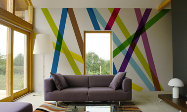 L’un de nos préférés, un papier peint panoramique hyper graphique avec ses bandes de couleurs qui se croisent tel un jeu de Mikado, On peut le commander sur mesure pour l’adapter à une grande ou petite surface murale. Mikabold : Exemple de prix : 140×240 cm, 152 € chez Gaf