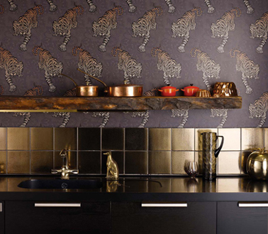 Papier peint pour cuisine imprimé de tigres avec petit effet hologramme à associer avec des meubles de cuisine noirs et une crédence en carreaux métal doré ou cuivre pour un effet lumière garanti. Papier peint lavable. Tigre W 654203 chez Ostorne & Little.