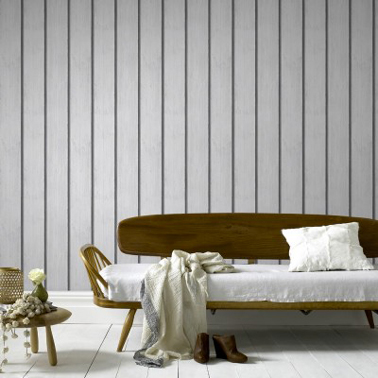 Envie d’une décoration du salon autour du thème du bois peint sans vous lancer dans un gros chantier, ce papier peint trompe l’oeil va vous plaire avec son aspect lambris gris clair des plus bluffants ! prix 24.90 € chez Atylia