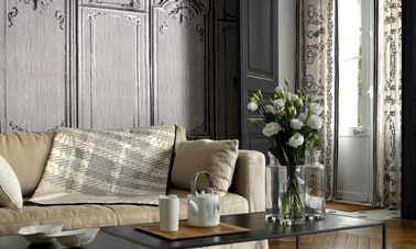 Un papier peint trompe l’oeil qui transforme un salon en un super décor hausmannien. Papier peint imprimé sur support intissé rouleau de 10m x 1m large. Collection Pleats Chez Elitis.fr