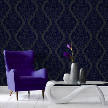 Option vintage pour ce papier peint d’un bleu profond à poser sur un seul mur et à asscoer avec des meubles design pour une ambiance baroque. rouleau de 1m sur 0.53cm : 72 € chez Atylia