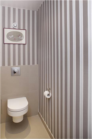 La déco des WC se conçoit aussi avec du papier peint et les rayures taupe et blanc sobres et élégantes ont en plus l’avantage d’agrandir l’espace. Rouleau : longueur 10 m largeur 53 cm. Taille des rayures : 5 cm. Disponible en 15 coloris. Print Stripe BP 758, prix : 115 € le rouleau Farrow & Ball