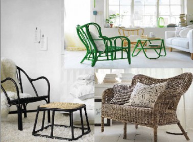 Le fauteuil et le repose pied en rotin noir (gauche) Les fauteuils en rotin vert et naturel et la table d’appoint verte ( haut droite) Le canapé en rotin (bas droite) Ikéa : Collection capsule Nipprig